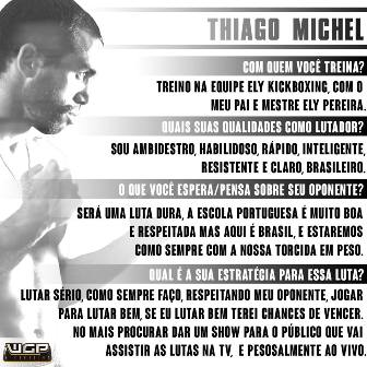 Thiago Michel, uma das principais referências no Kickboxing, tem em seu cartel 168 lutas, 137 delas na trocação, com apenas duas derrotas. Michel é atleta contratado do Glory, principal competição mundial de Kickboxing. O lutador fez sua estréia no Glory no final do ano passado e derrotou um atleta da argentina. Thiago é conhecido pelo seu Kickboxing afiado e contundente. É dono de potentes golpes giratórios e descentes destruidores. O confronto contra o português Ricardo Fernandes será na super luta (card principal) na categoria 75 kg.